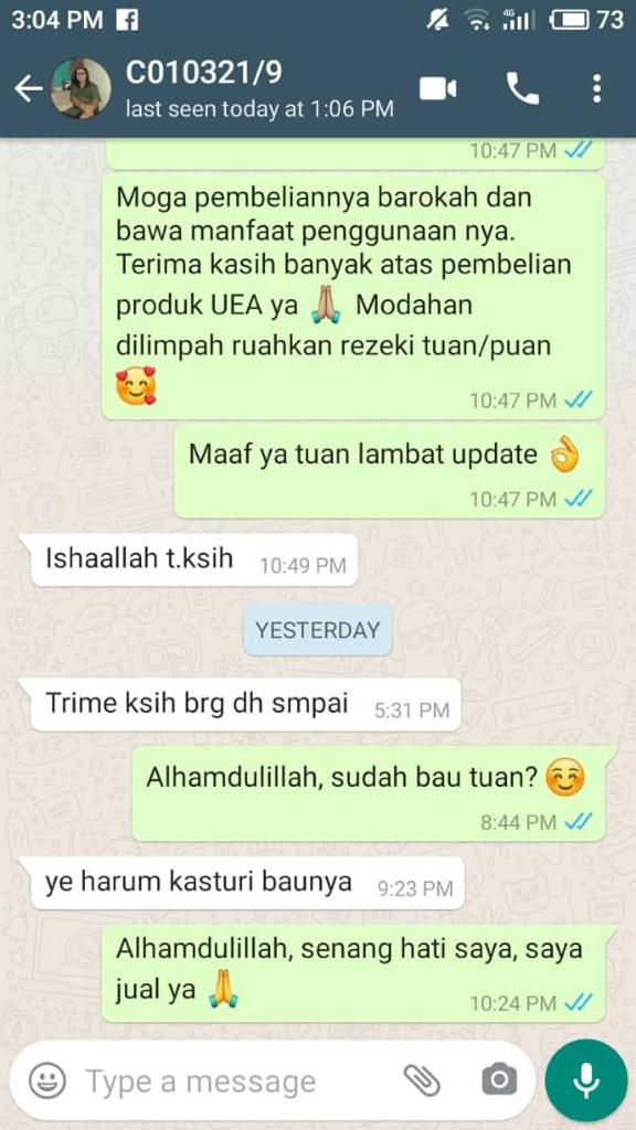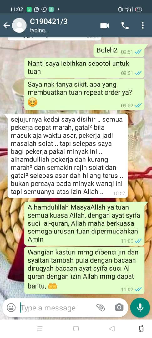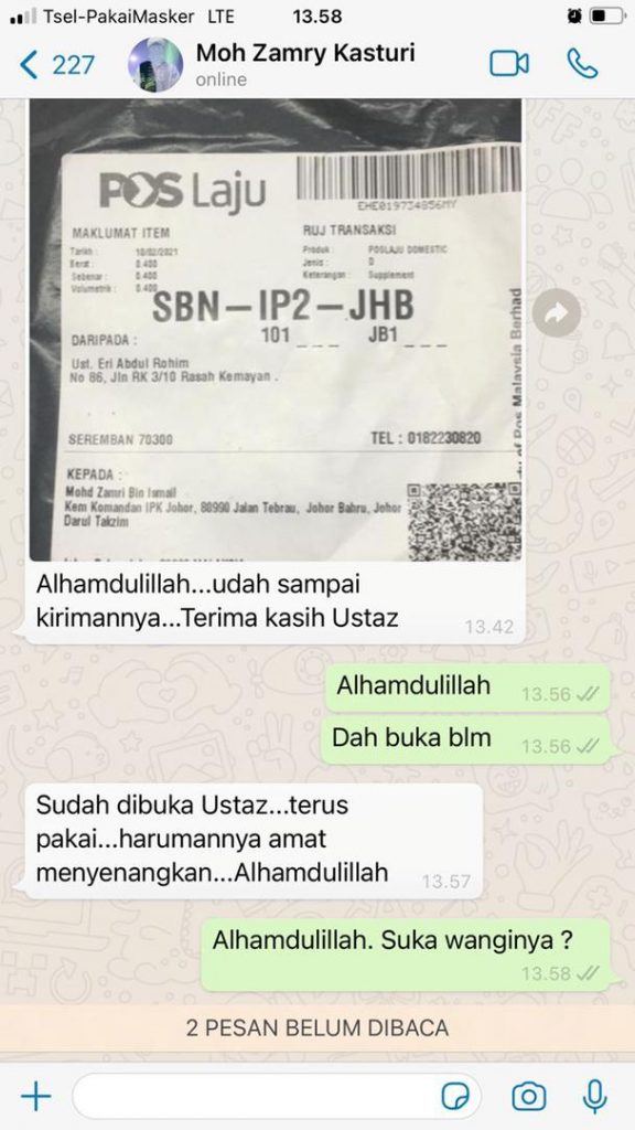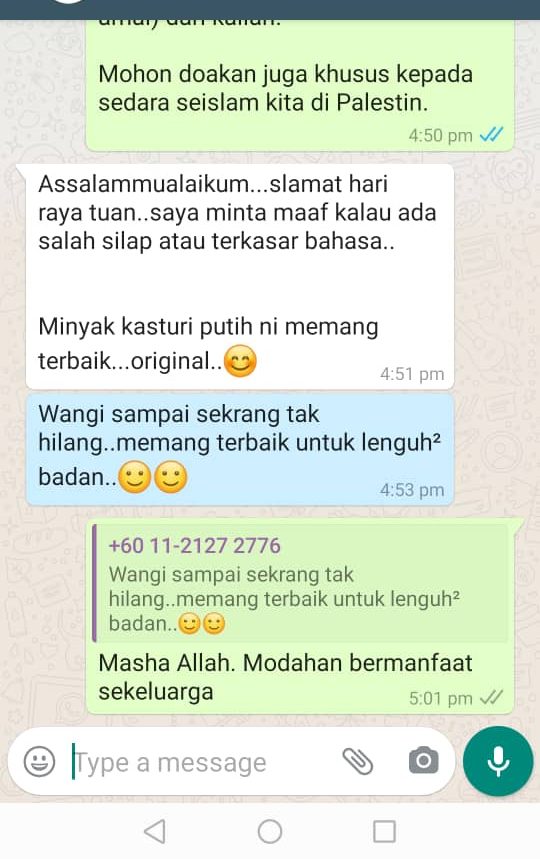 PERHATIAN ! BAU HARUM WANGIAN INI BOLEH BERTAHAN BERJAM-JAM. HANYA GUNA BEBERAPA TITIK, BAU LEMBUT HARUMAN KASTURI KEKAL LAMA... ITU BUKTI KASTURI PUTIH INI 100% ASLI Mengapa MESTI Wangian Kasturi?? MANFAAT WANGIAN KASTURI Wangian yang paling dicintai Rasulullah S.A.W Wangian disenangi suami isteri Bau Wangian Syurga Wangian Menenangkan Jiwa Membantu khusyuk beribadah Wangian ini dibenci oleh jin syaitan PENTING !!Apa sahaja yang menjadi kesukaan Nabi, ianya menjadi kebencian bagi Syaitan... Cara Menggunakan Wangian Kasturi ORDER SEKARANG, BARANG SAMPAI BARU BAYAR Kasturi dah sampai depan rumah, baru bayar kepada penghantar. Sangat Mudah... SemenanjungCOD +RM10 Barang akan sampai dalam 3-5 hari bekerja bergantung pada lokasi penerima. Sila sediakan wang tunai yang mencukupi untuk dibayar kepada penghantar. Penghantar akan menghubungi anda melalui SMS / Panggilan telefon sebelum membuat penghantaran. PAKEJ RM100 BELI 2 BOTOL FREE 4 BOTOL ORDER RM100 PAKEJ RM150 BELI 3 BOTOL FREE 7 BOTOL ORDER RM150 PAKEJ RM50 BELI 1 BOTOL FREE 2 BOTOL ORDER RM50 NAK ORDER MELALUI WASSAP ? CLICK BUTANG DI BAWAH ORDER DEKAT WHATSAPP 100% Wang Dikembalikan Dijamin Kasturi Asli 100% Penghantaran Selamat TESTIMONI PENGGUNA ORDER SEKARANG